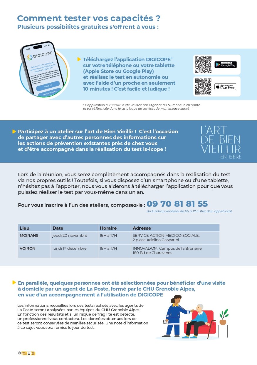 Le Département de l’Isère, le CHU Grenoble Alpes, La Poste et leurs partenaires ont lancé en 2023 et 2024 une expérimentation dans deux territoires pilotes (Le Grésivaudan et Grenoble). Objectif ? S’appuyer sur le programme de prévention ICOPE (Integrated Care for Older People) de l’OMS, qui vise à repérer de manière précoce les fragilités chez les personnes âgées.