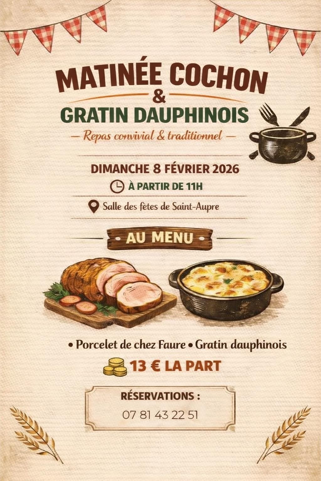 Réservez dès maintenant votre part de porcelet et gratin dauphinois du Foyer Sully !