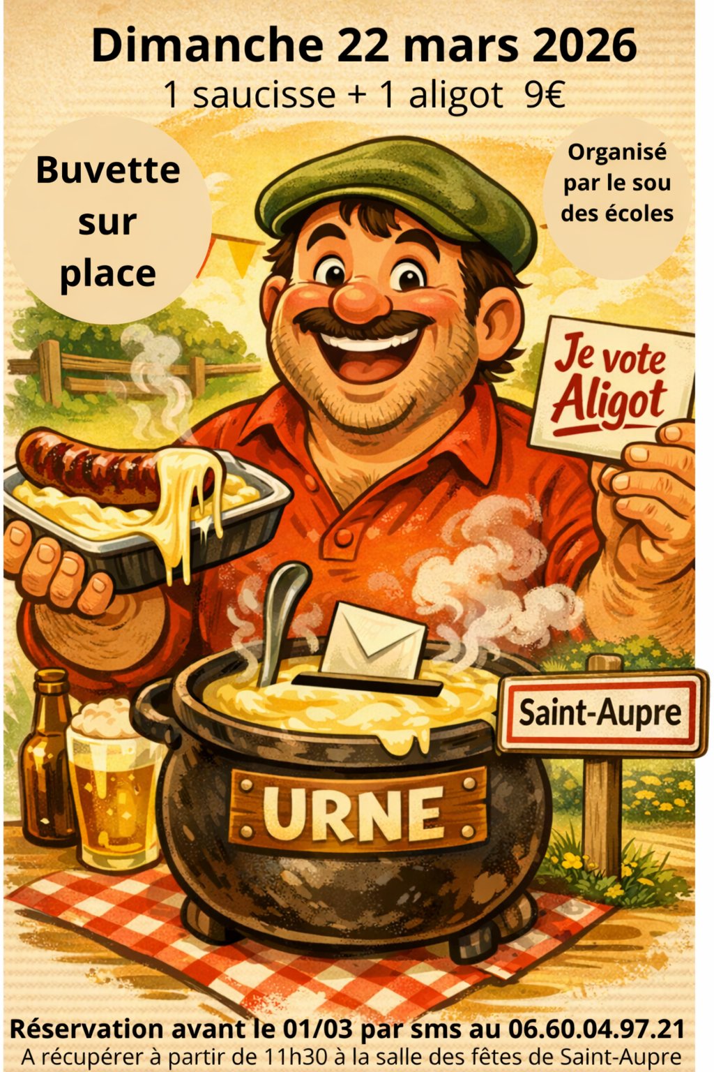 1 saucisse + aligot pour 9€ à récupérer à partir de 11h30 à la salle des fêtes de Saint-Aupre